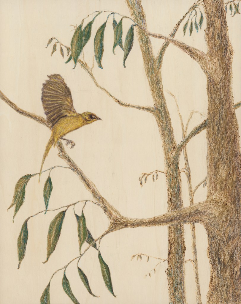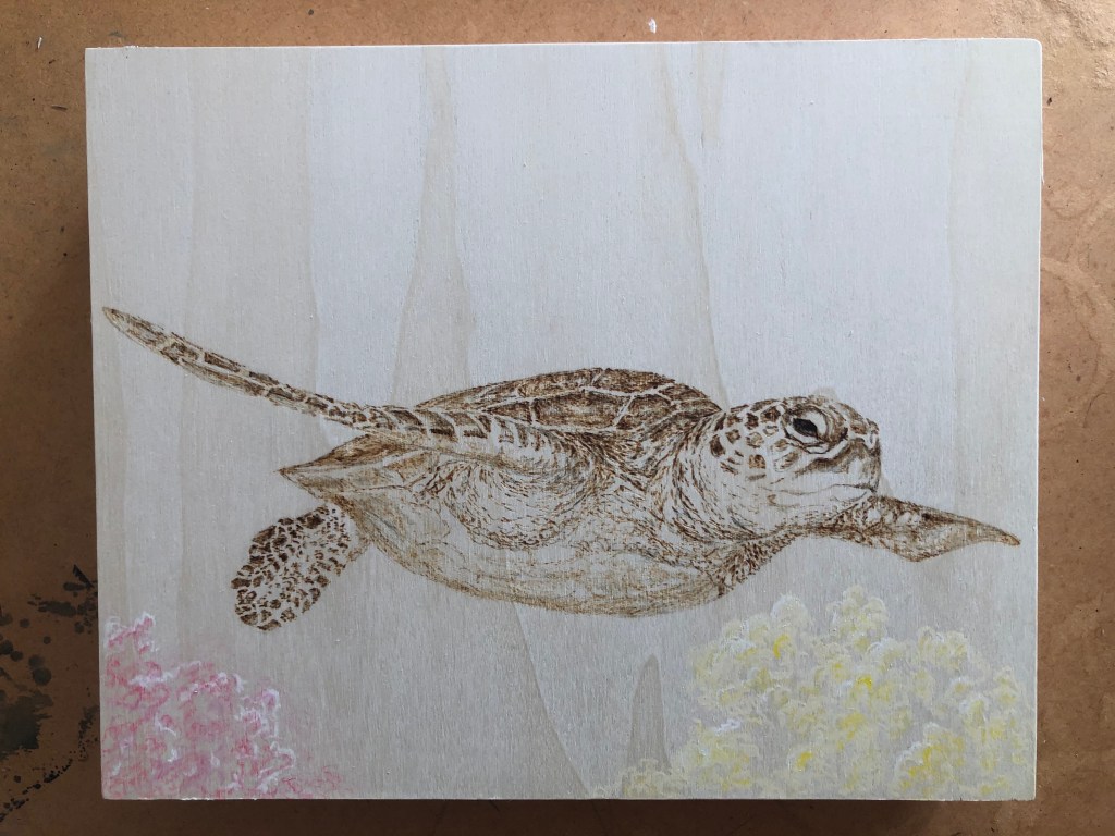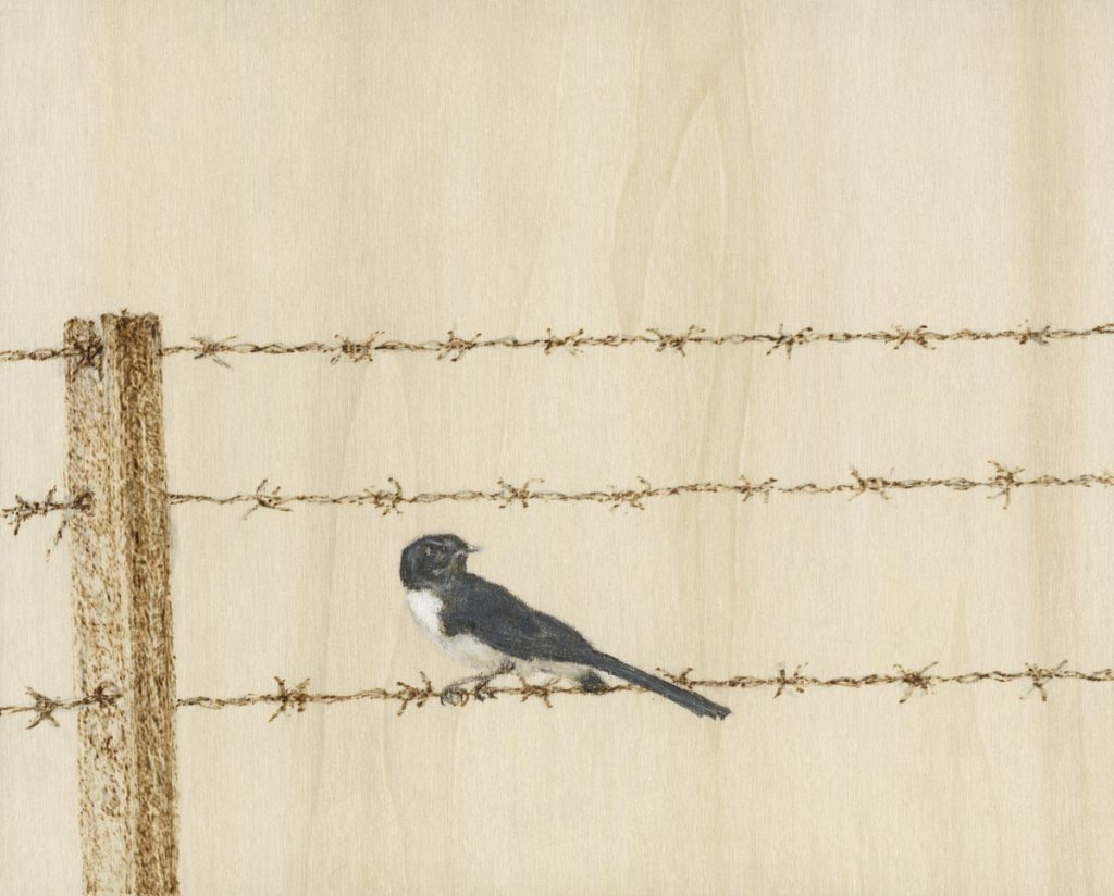 I predominantly apply techniques that include acrylic, pencil work, both graphite and coloured, and Pyrography. Pyrography is the process of wood burning and allows me to engage more with my work.